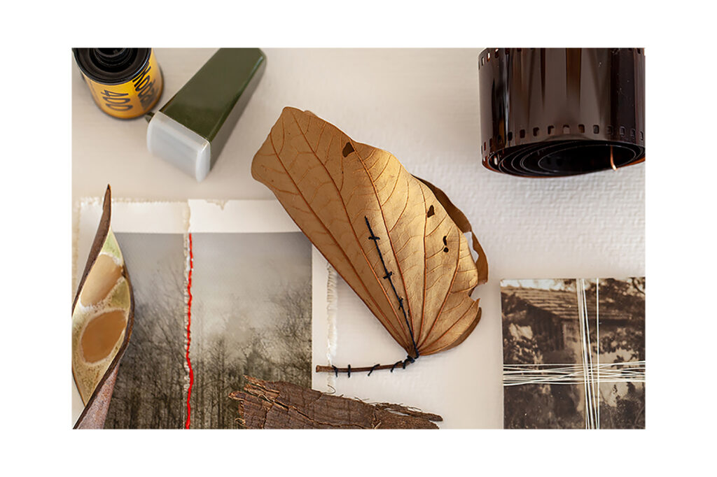 PEQUENO RELICÁRIO DOS DIAS QUE JÁ MORRERAM (2025) Ficha técnica: porta-joias, papel aquarela com folha bordada e costurada à mão, rolo de filme, pequena escultura de filme fotográfico fechada com fio de cobre, folha seca e casca de árvore, fotografia impressa em canvas bordada à mão, pilha de fotografias amarradas com linha, monóculo fotográfico antigo. […]